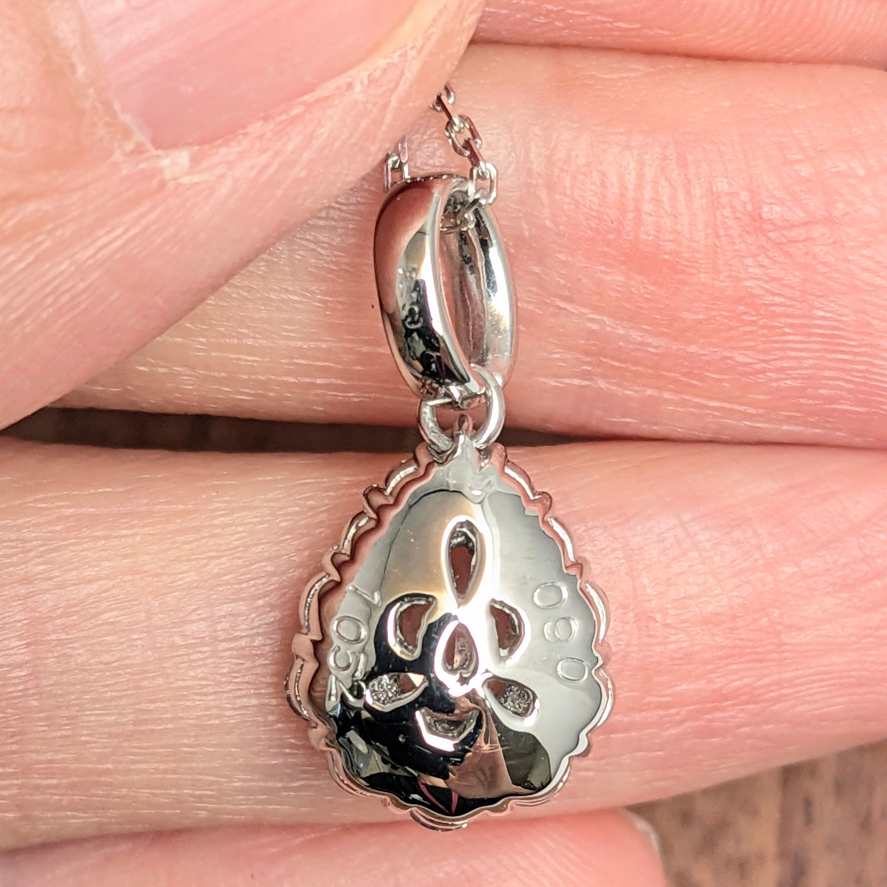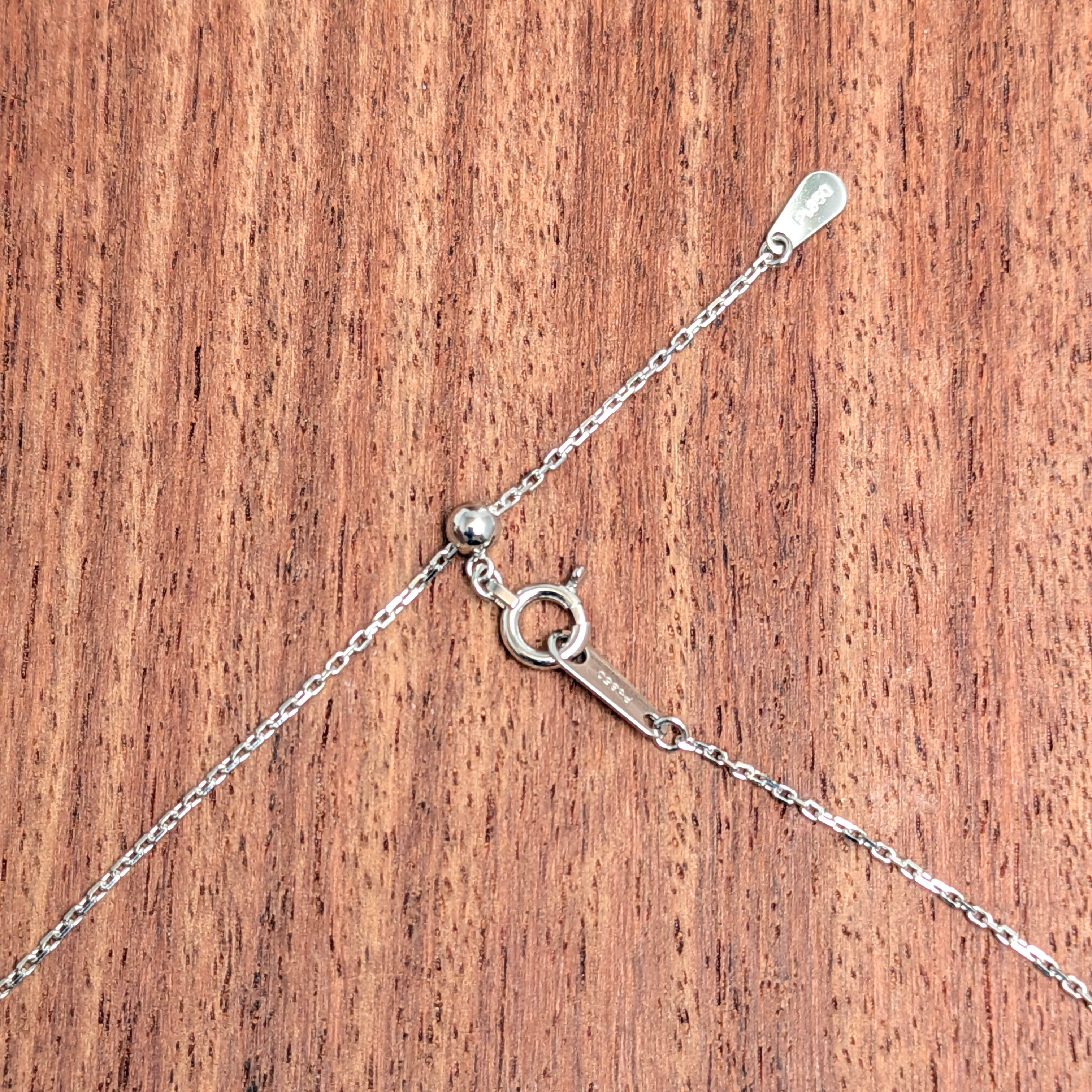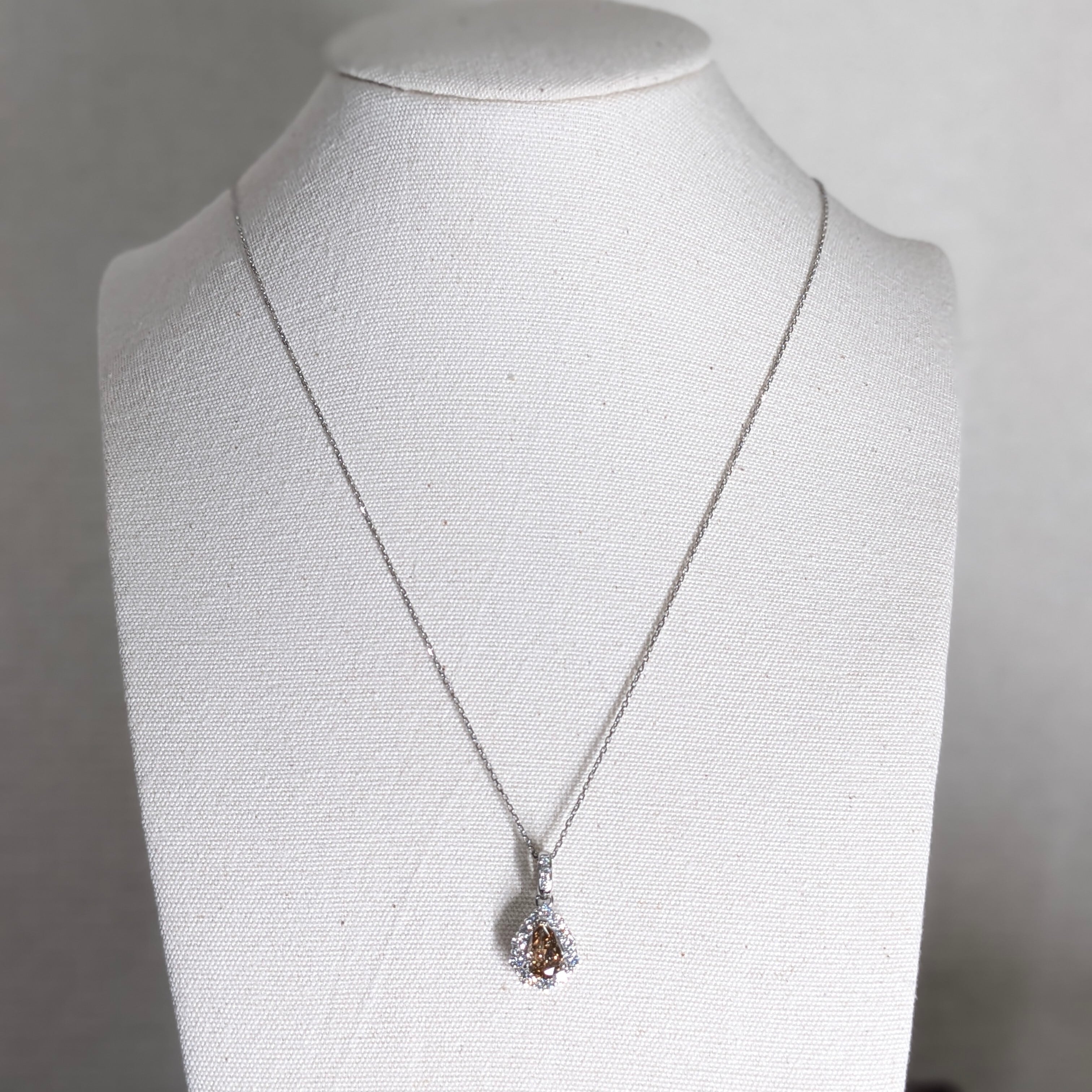 色相的には“ファンシーブラウン”。大地の雫のようなブラウンに、真冬の早朝に降り立った霜の煌めきのような虹色のブリリアンスが美しいダイヤモンドを使用したネックレスです。合計0.60ctの、ちょっと粒感が大きめのメレダイヤもSIクラスではありますが、限りなくカラーレスで、とても輝きの強いものがセレクトされています。カット小豆のチェーンの煌めきと相まって、“ブラウン”という色合いからは想像できないほどの華やかさのあるネックレスです。