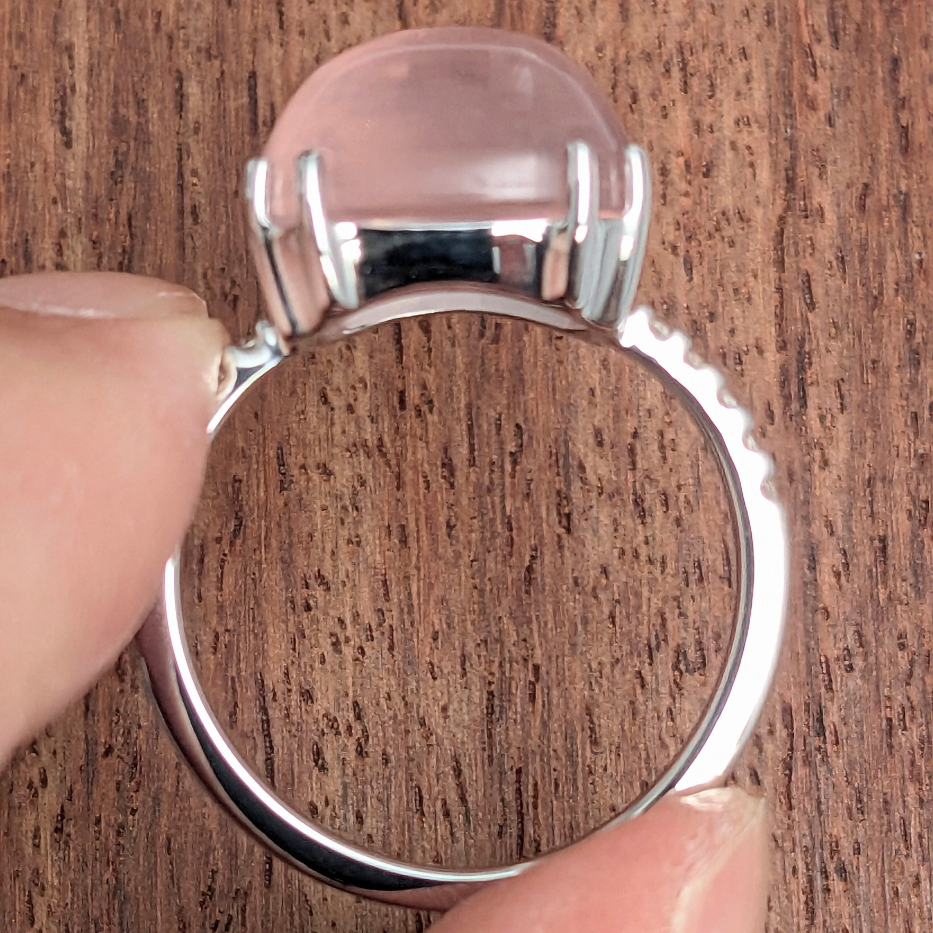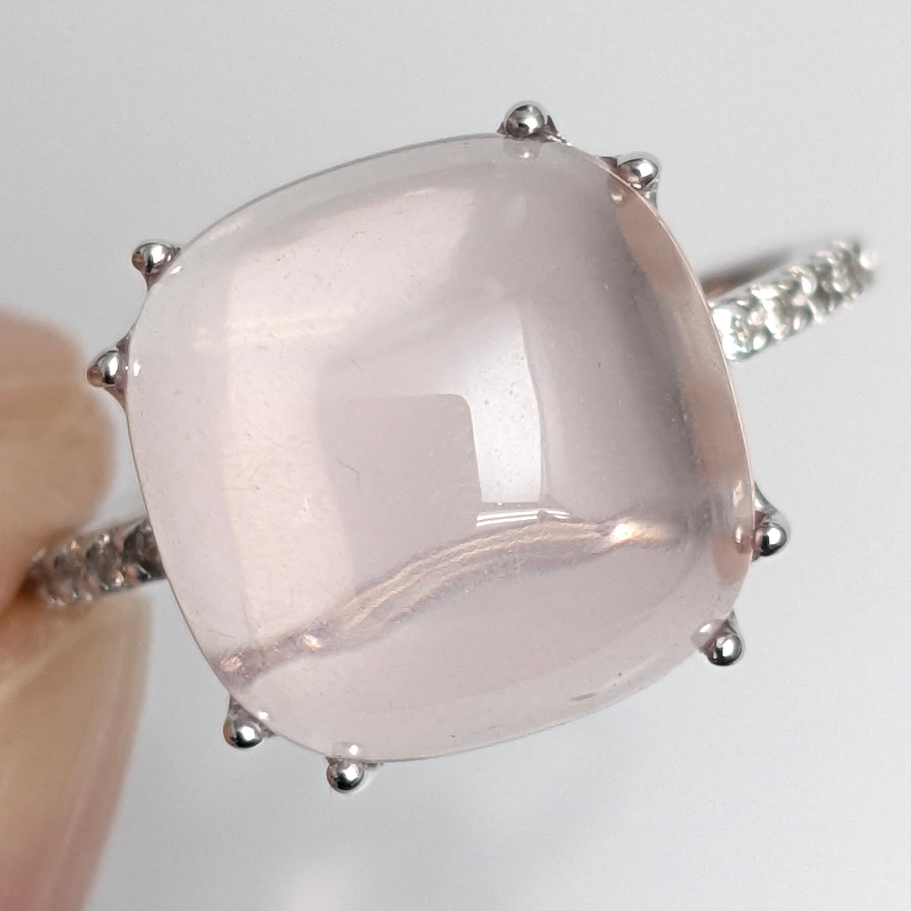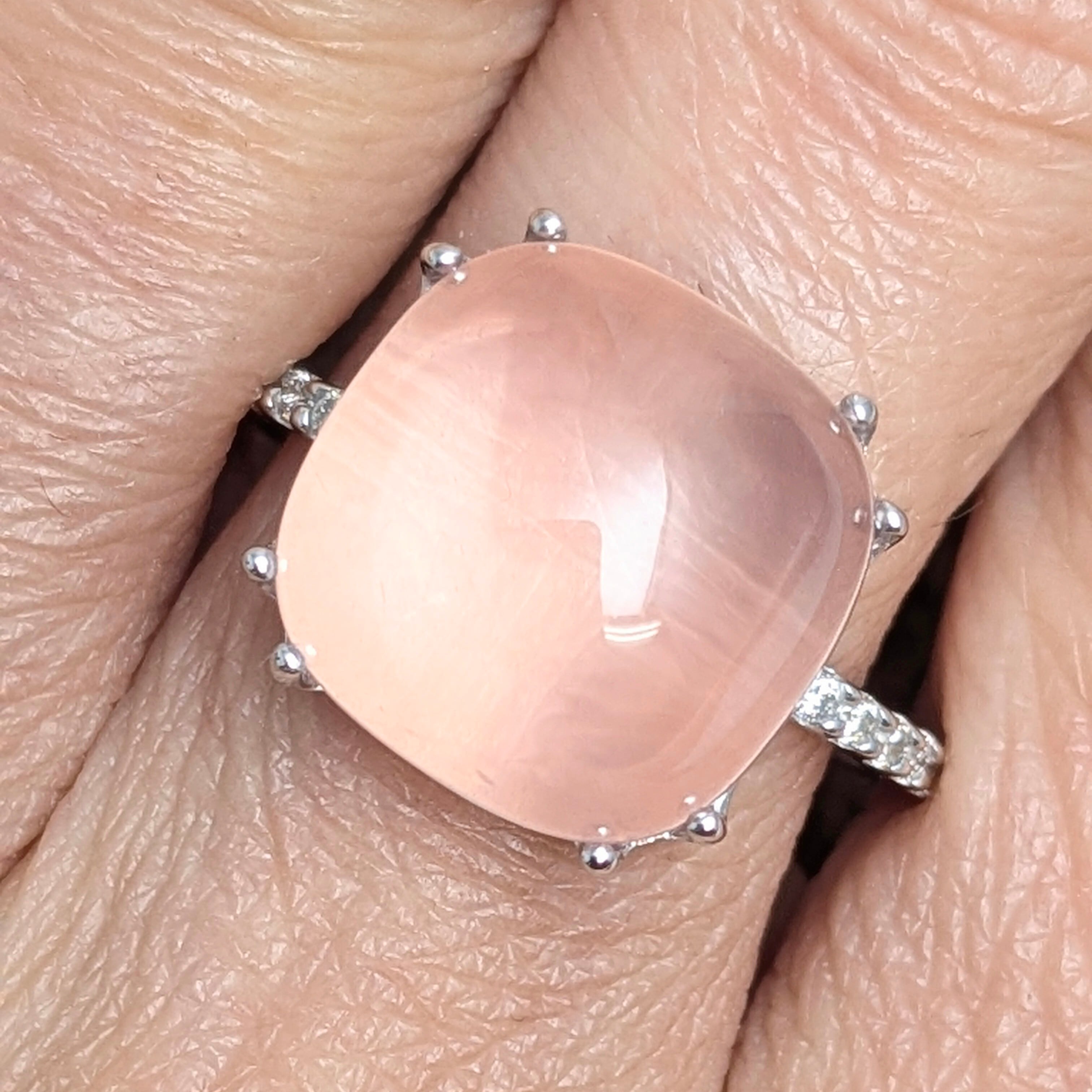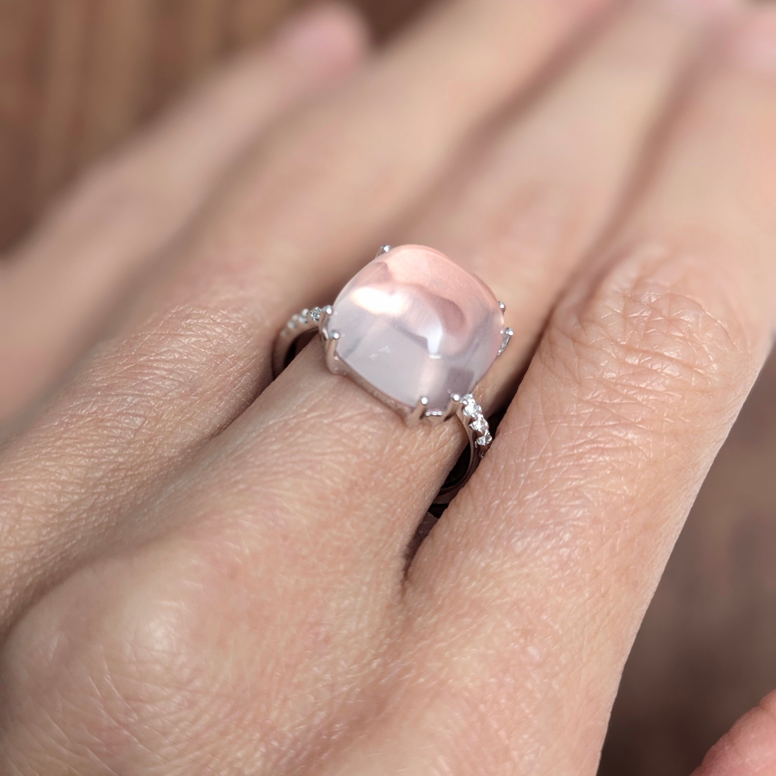 まるで“ストロベリー・ムーン”と呼びたくなるような、赤味を帯びた乳ピンク色がとっても可愛らしいリング。メインの石は「ローズクォーツ」です。カラット数の刻印はありませんが、石の寸法はおよそ11.8×11.7×6.4mmと結構ボリュームがあります。両サイドのメレダイヤの輝きにも勝る、艶めき感と独特の色合い。「愛の石」と呼ばれるにふさわしい、慈愛に満ちた柔らかな輝きが美しいリングです。