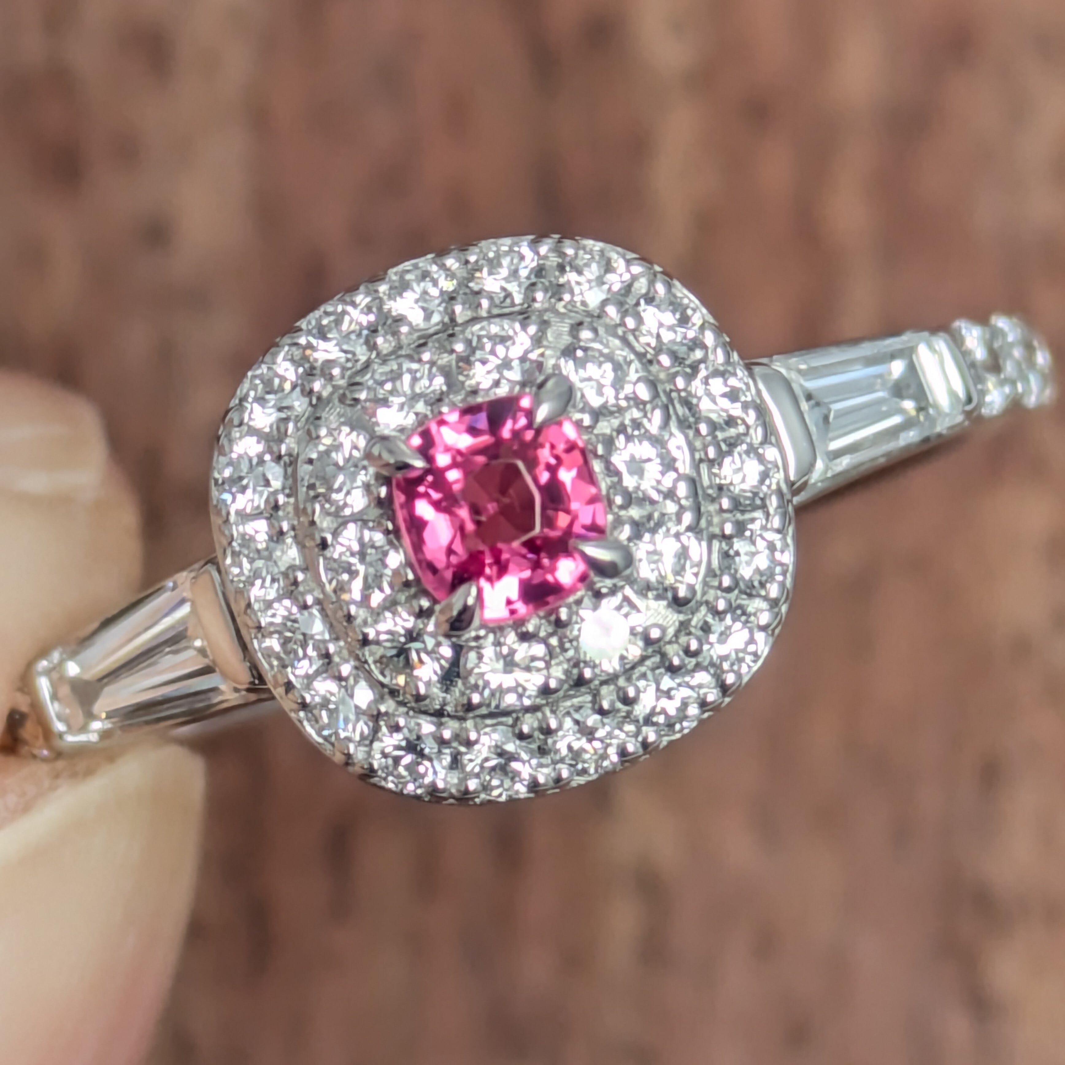 カーブを描く、ベゼル(石座)のクッション型がアンティークな雰囲気を醸し出している一品。腕の部分にかけて、ラウンドブリリアントカットだけではなくテーパーカットのダイヤモンドを挟んでいる点も、雰囲気の演出に一役買っています。メインに据えられた可憐なピンクスピネルは、ひとたびブラックライト(紫外線)に当たるとその姿を一変させます。普段は外に出さないその情熱的な姿・・・是非、あなたの目でご確認ください。