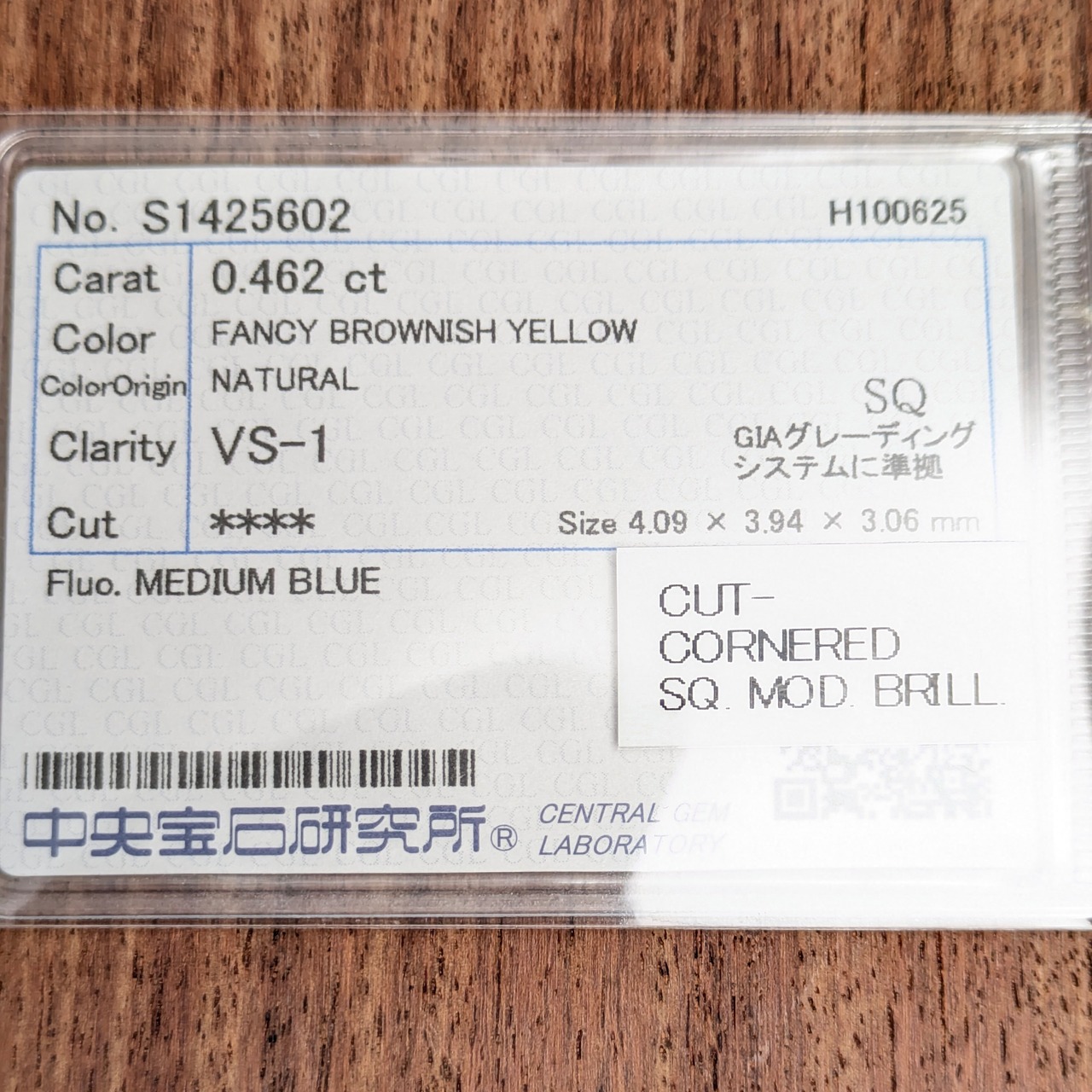 付属品:FANCY BROWNISH YELLOW VS1 CUT-CORNERED SQ. MOD. BRILL. 中宝研ソーティング