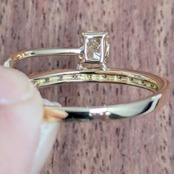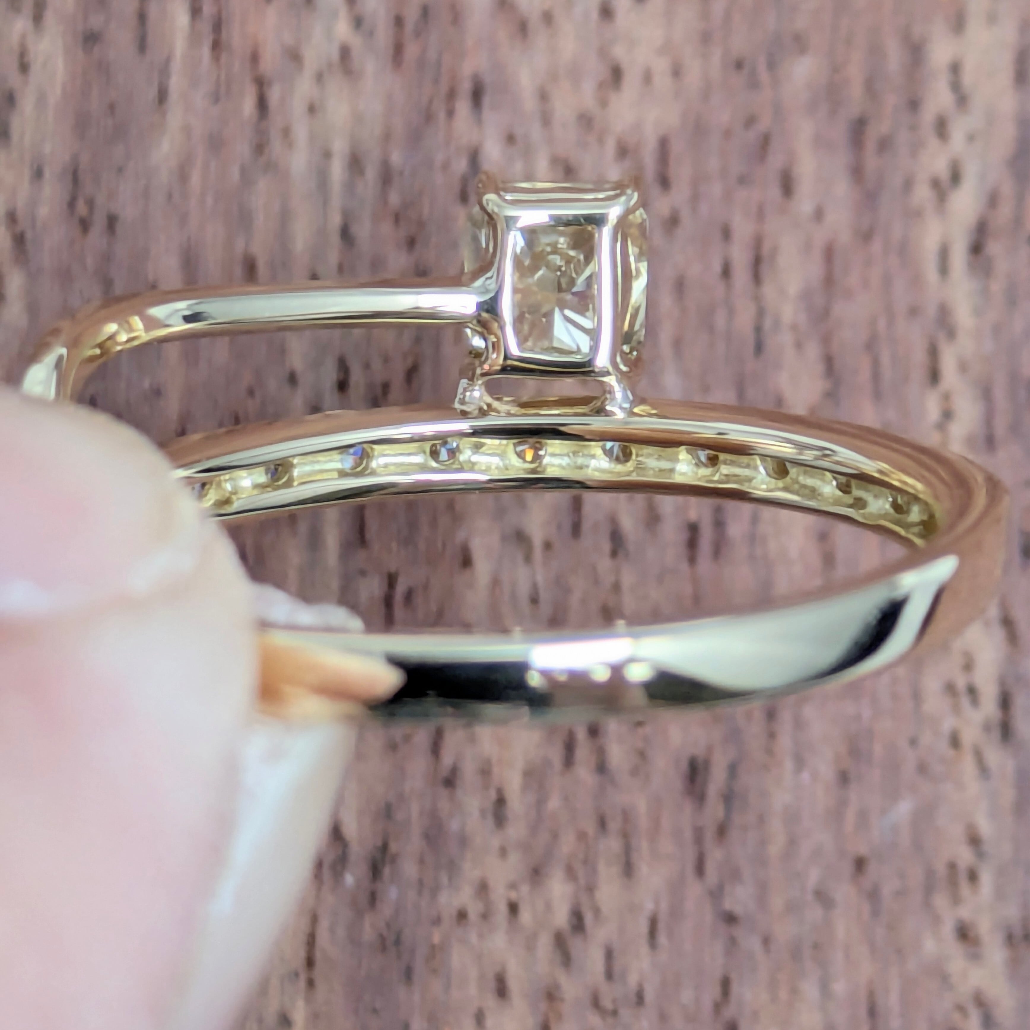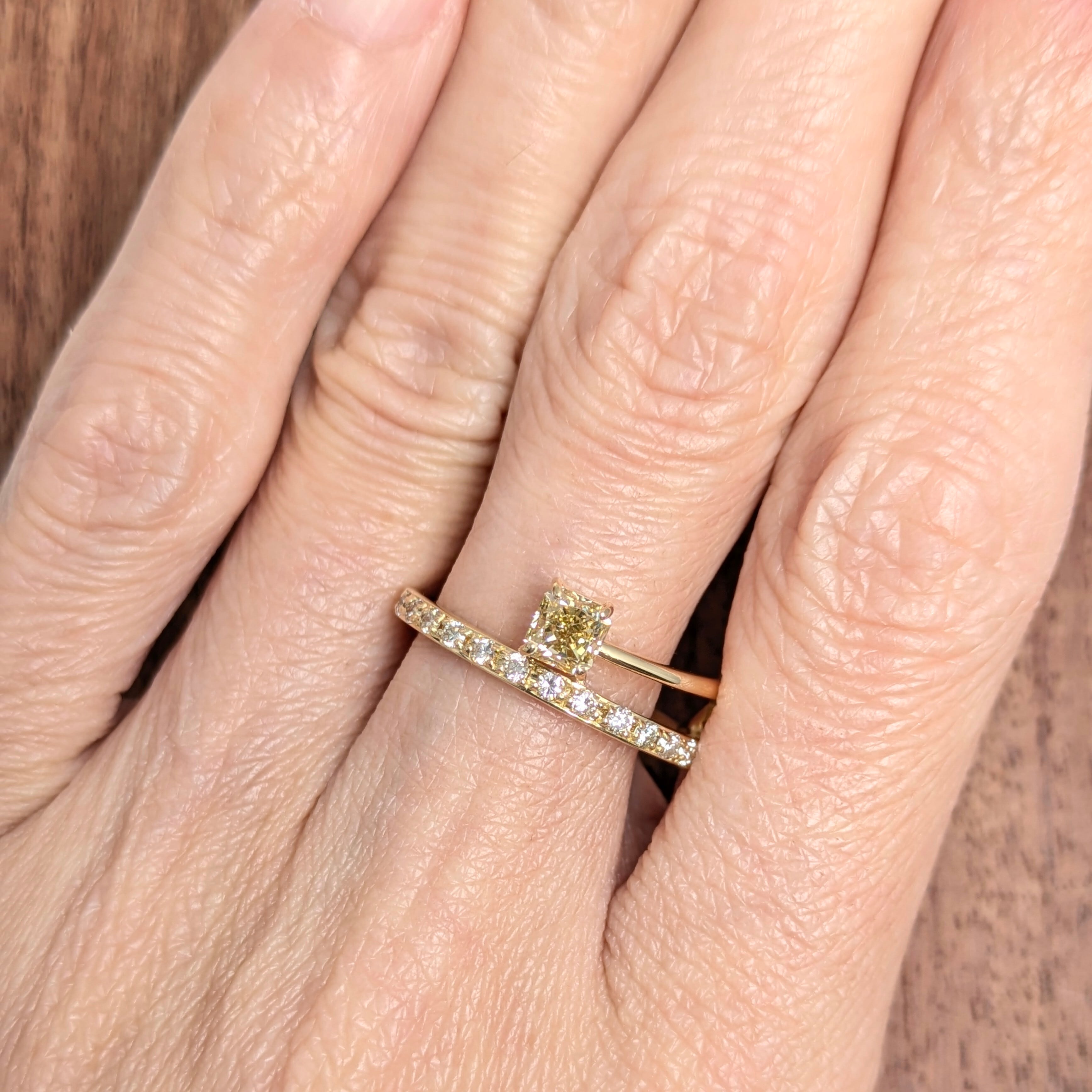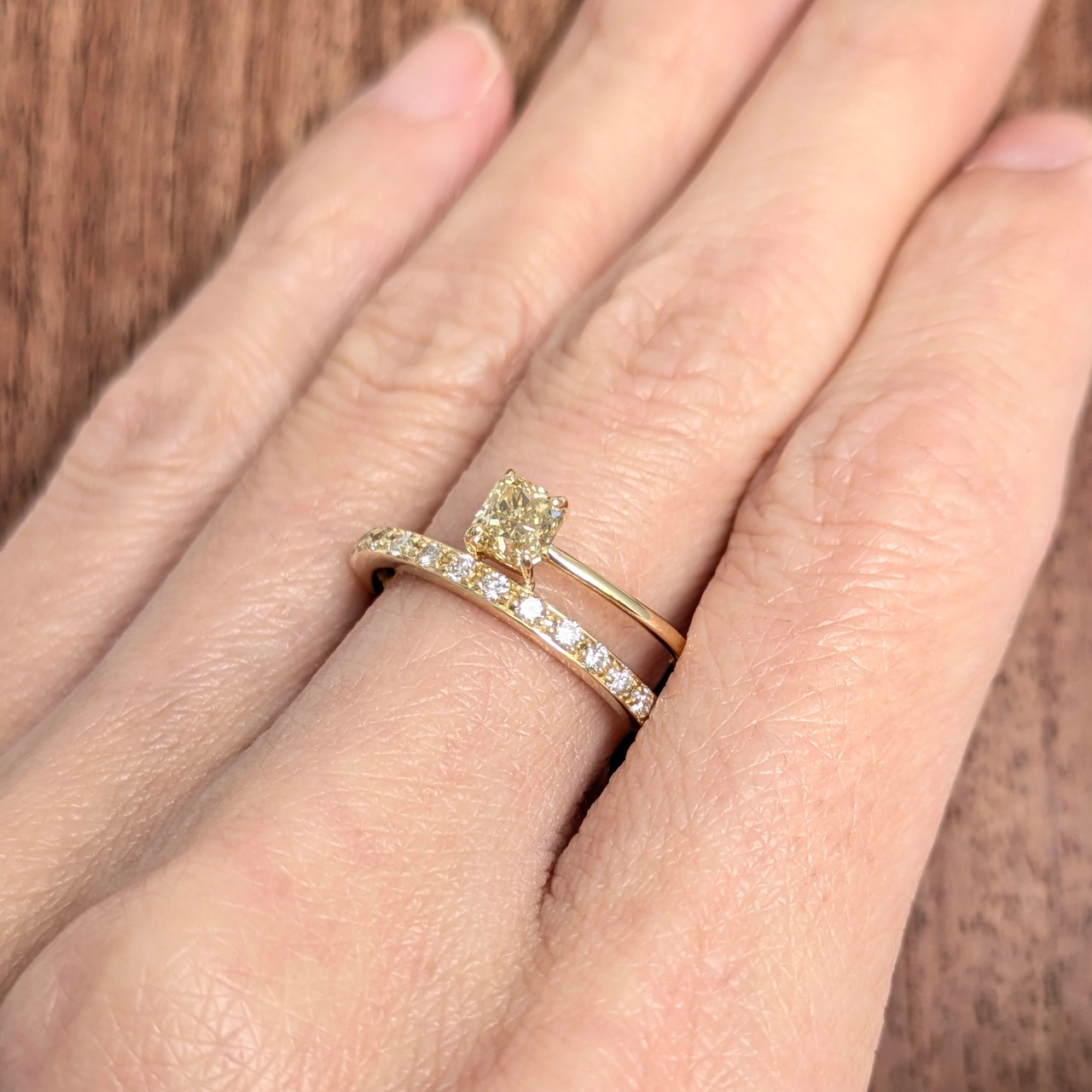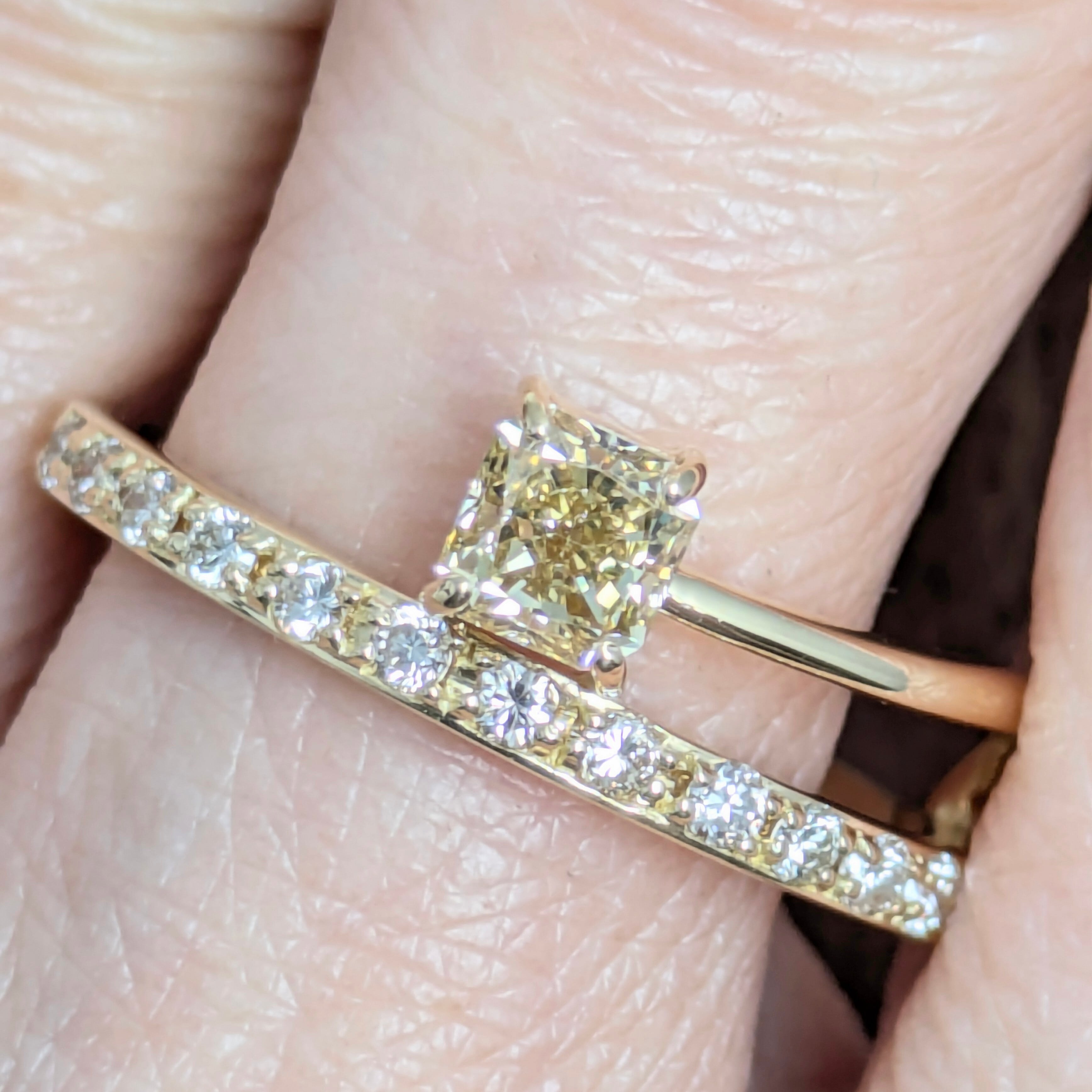 流れるようなイエローゴールドの曲線と、色相がマッチした黄金色のダイヤモンドとのコンビネーションが非常に美しいリングです。メインのダイヤモンドは輝きを重視したスクエアモディファイド。ブラウン味をかんだイエローでありながら煌めきが強いために、まるで透き通ったゴールドのような眩さ!左右非対称なデザインでモダンに、スタイリッシュに、そしてさりげなく個性を演出してくれそうです。クラリティも、申し分なしの“VS-1”☆