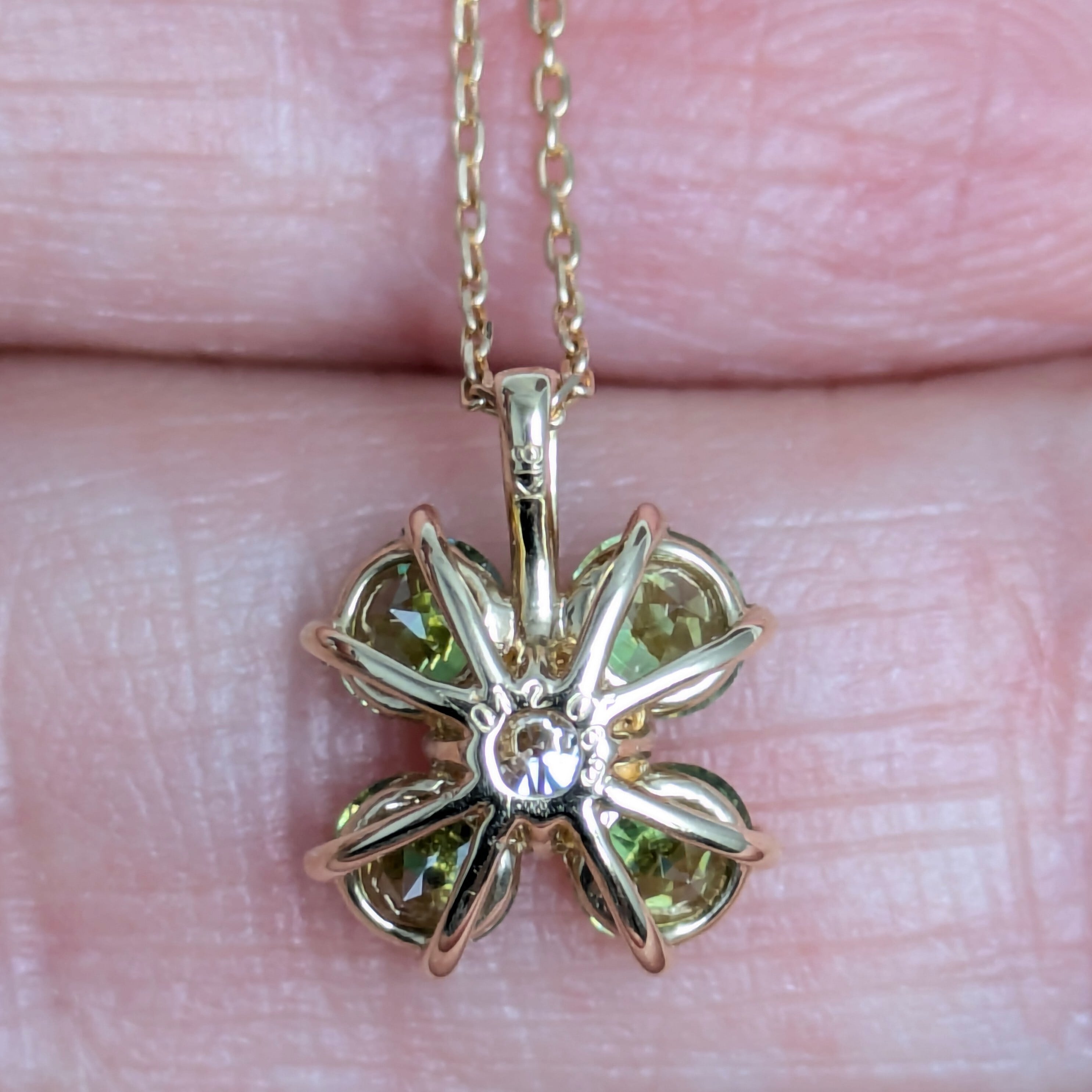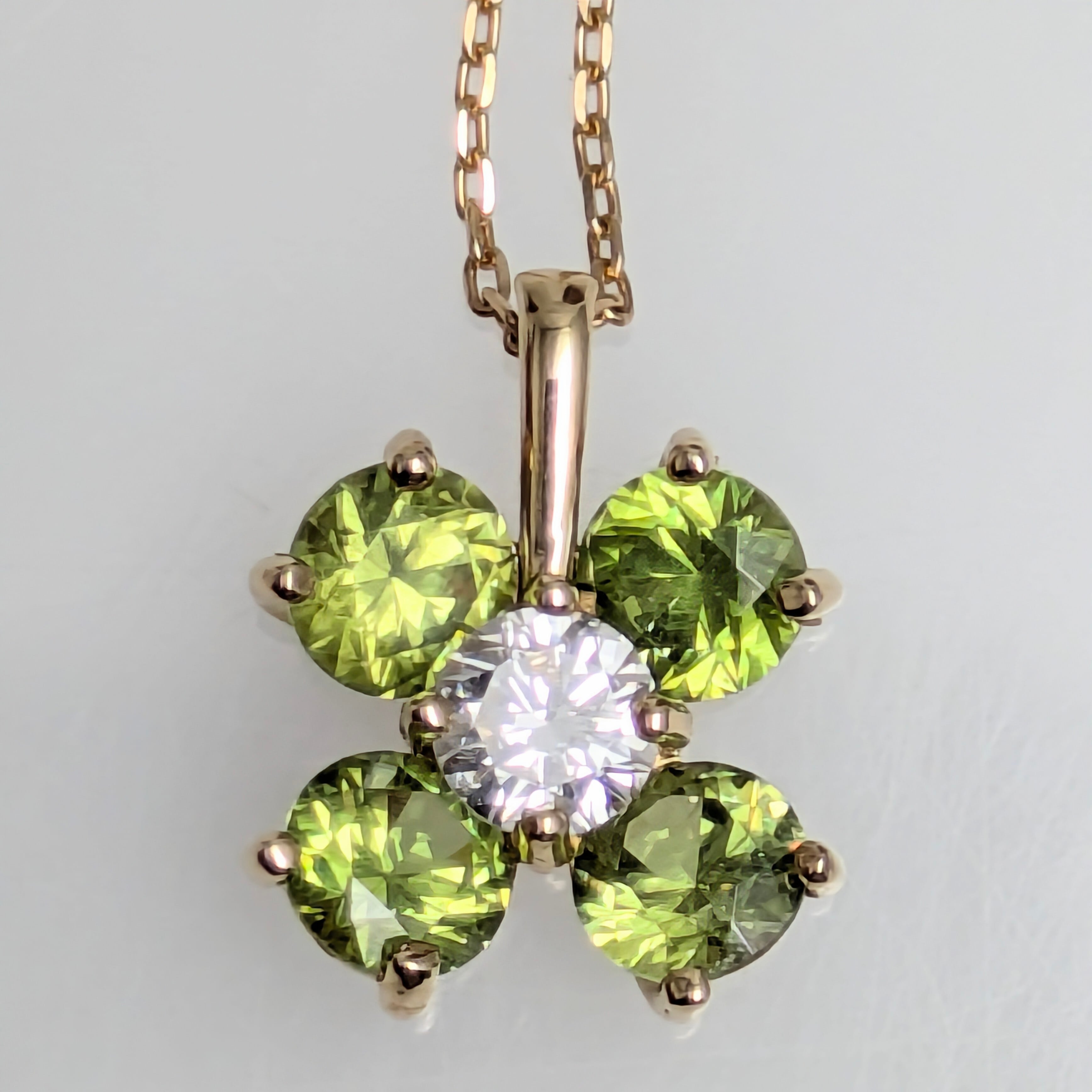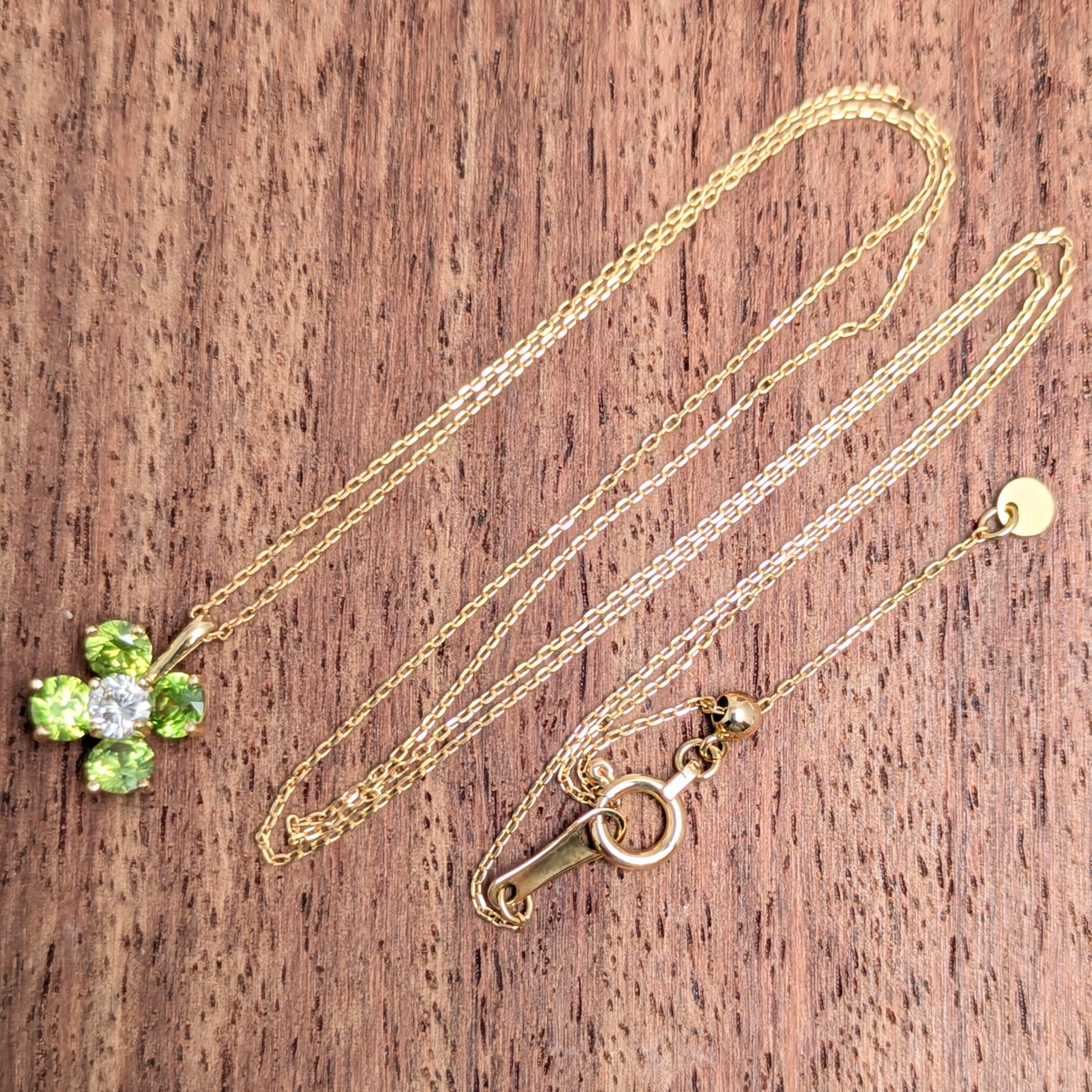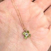 写真に捉えることはできていないのですが、使用されている4ピースのデマントイドガーネットは全て「ホーステイル」入りのロシア産。印象的な黄緑色とセンターのダイヤモンドに負けず劣らない強い輝きにウットリしてしまうネックレスです。もしルーペをお持ちの方には是非拡大してご覧いただきたいのですが、この美しい色に隠しきれない七色のファイアがやっぱり一番のチャームポイント!インクルージョンと輝きのバランスが抜群のデマントイドです☆