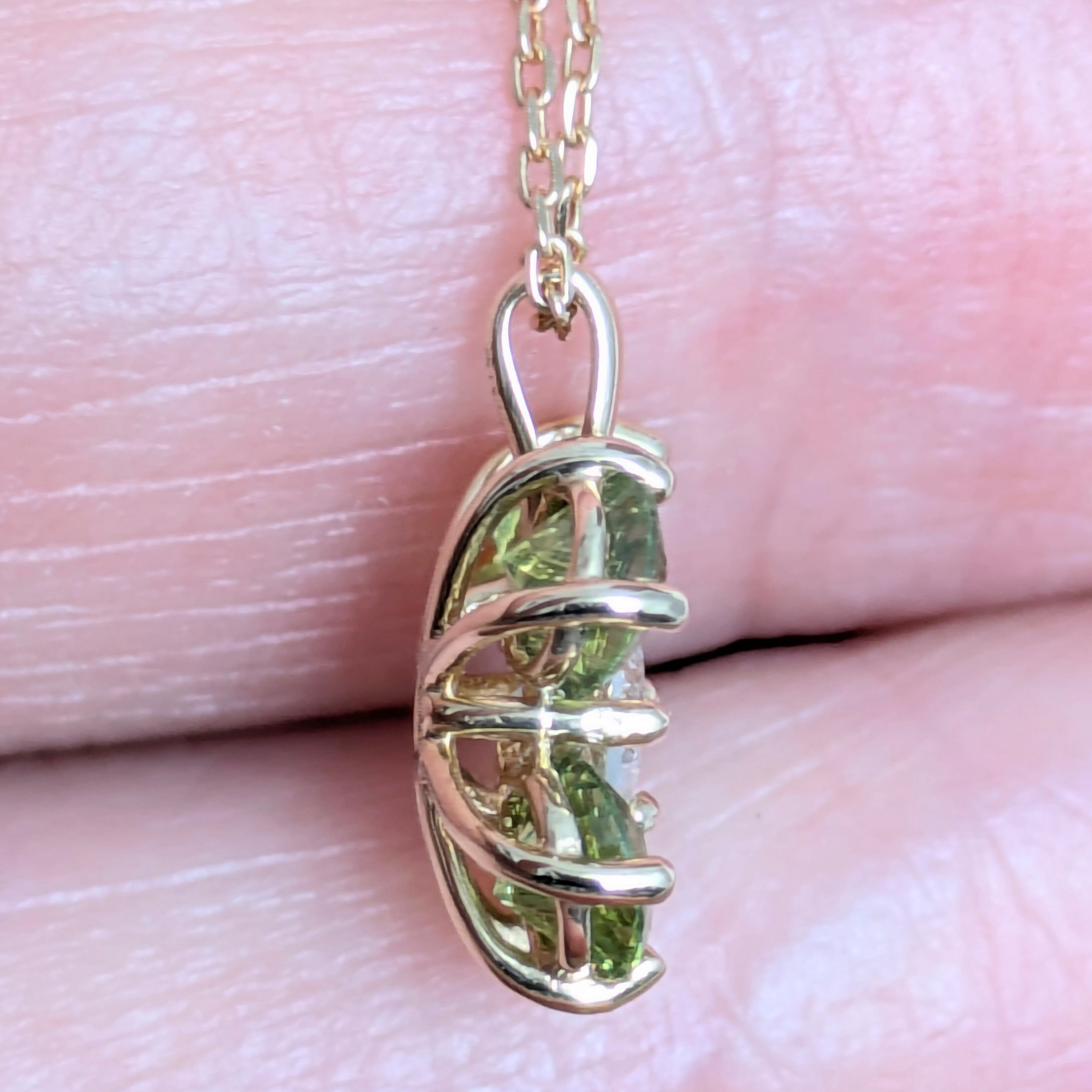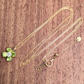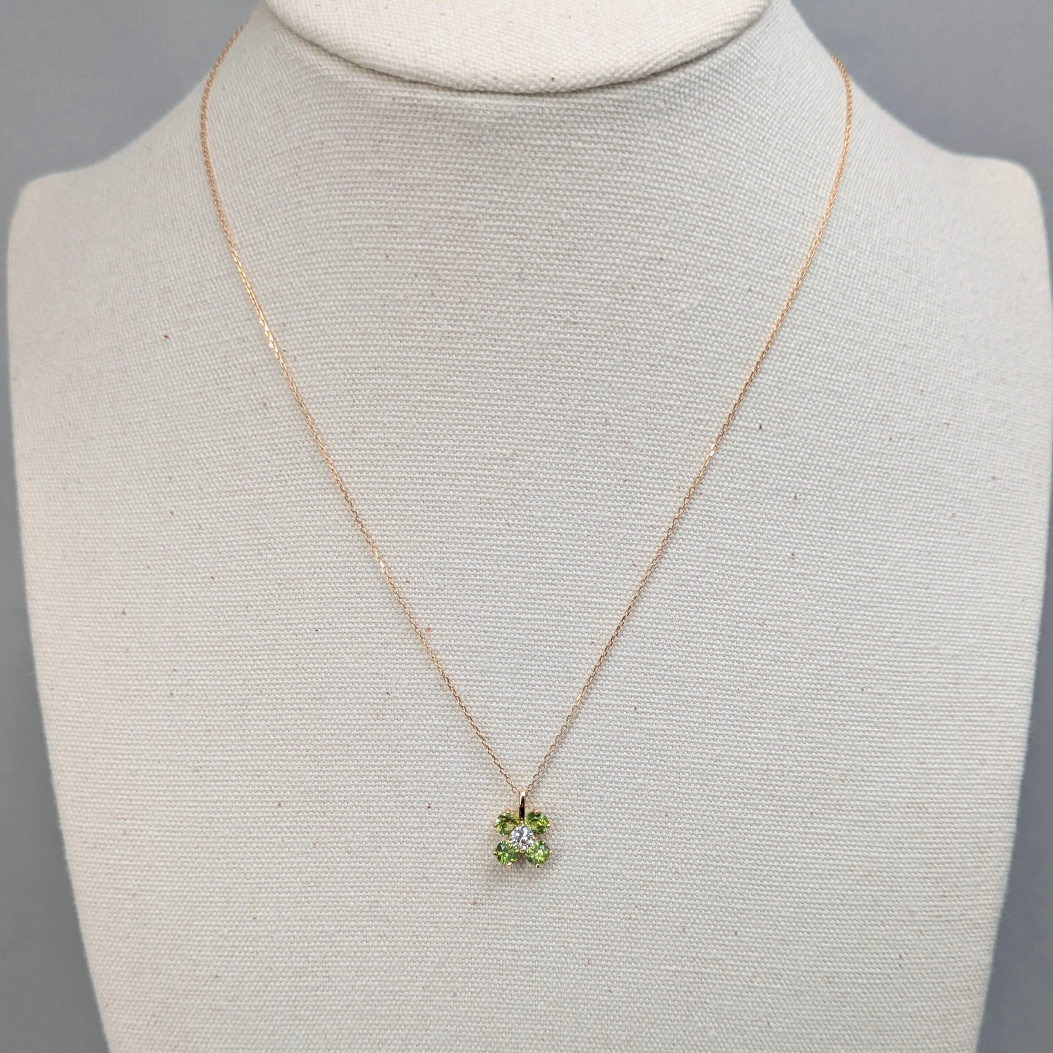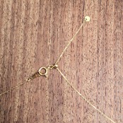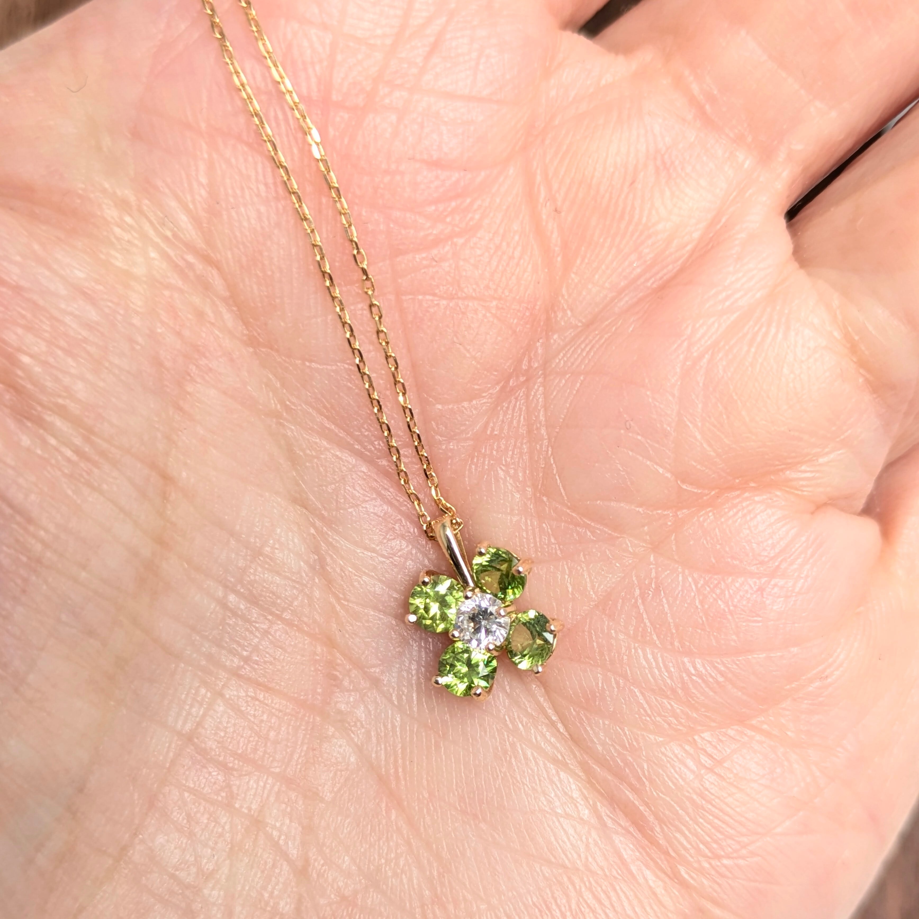 写真に捉えることはできていないのですが、使用されている4ピースのデマントイドガーネットは全て「ホーステイル」入りのロシア産。印象的な黄緑色とセンターのダイヤモンドに負けず劣らない強い輝きにウットリしてしまうネックレスです。もしルーペをお持ちの方には是非拡大してご覧いただきたいのですが、この美しい色に隠しきれない七色のファイアがやっぱり一番のチャームポイント!インクルージョンと輝きのバランスが抜群のデマントイドです☆