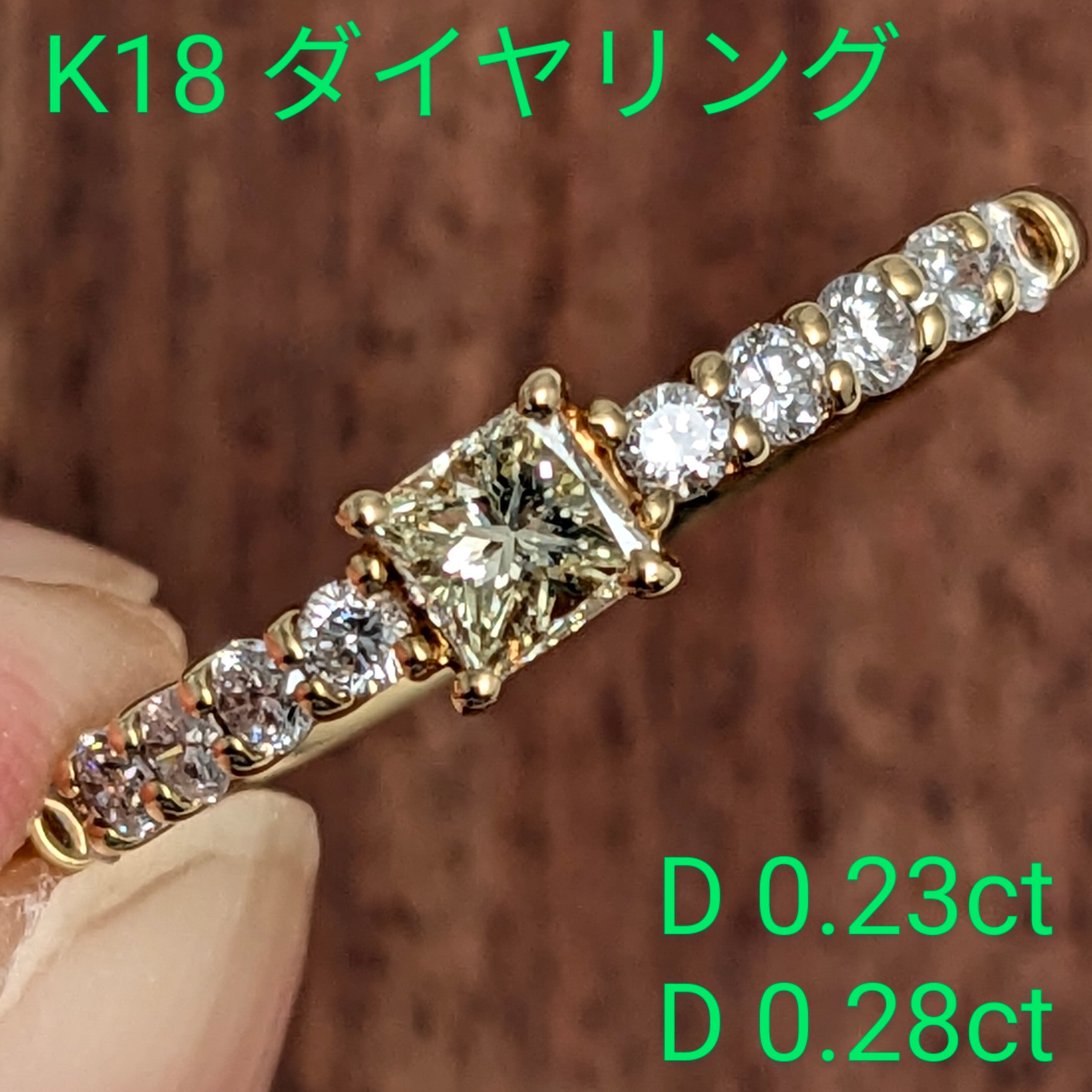 センターはプリンセスカットで、だいたいベリーライトイエローのSIクラスのダイヤモンドです。ゴールド枠ですがカラーレスのメレダイヤが良いアクセントになっていて、華やかですがTPO関係なく活躍できそうなリングです。